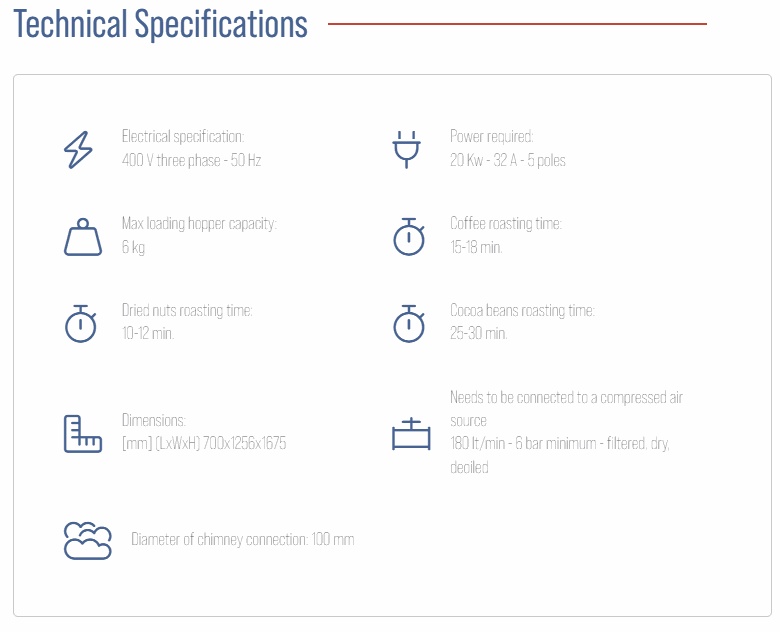It uses an original and exclusive air cyclone system ( Vertiflow® patent), a versatile technique for the roasting of coffee, hazelnuts, almonds and pistachios.